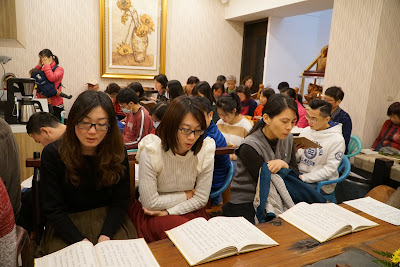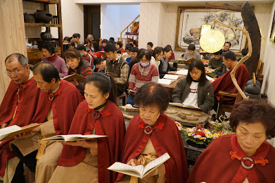 | 小嬰兒也乖乖地與父母一起誦經 |
